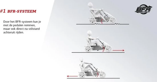 De BERG Rally is uitgerust met het unieke gepatenteerde BFR-systeem. BFR staat voor Break, Freewheel en Reverse. Door het BFR-systeem kun je met de pedalen remmen, maar ook direct na stilstand achteruit rijden. Dit maakt de BERG Rally super eenvoudig en gemakkelijk te berijden.