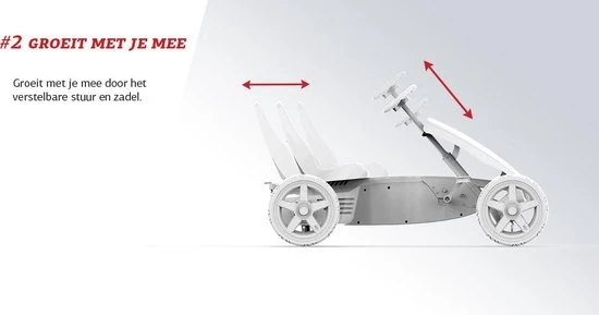 Het stoeltje heeft drie standen zodat je altijd bij de trappers kan komen. Daarnaast is het Rally stuur traploos te verstellen in stuurhoogte zodat je eenvoudig de juiste hoogte bepaald.
