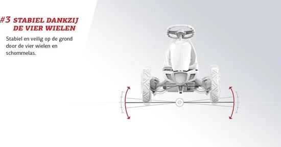 Dankzij de vier wielen heeft de BERG Rally een uitstekende stabiliteit. Hierdoor kan je snel, scherp en veilig door de bochten. Daarnaast is kantelen vrijwel onmogelijk doordat er geen kantelpunt ontstaat.