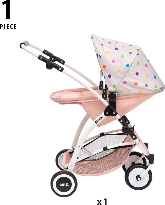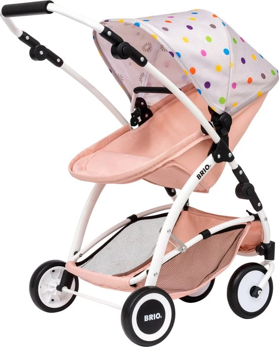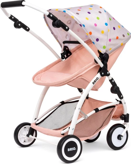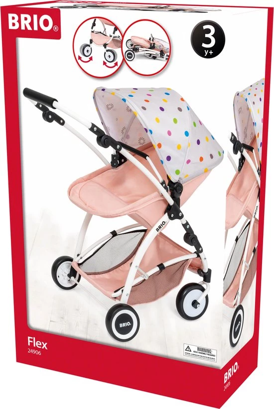 Hoogwaardige Flex poppenwagen in klassiek BRIO-ontwerp met stippenpatroon. Met draaibare en afneembare mand, verstelbare kap, voetsteun en handgreep, inklapbaar frame, roterende voorwielen en een ruime winkelmand onderin. Gemaakt van hoogwaardige metalen, kunststoffen en textiel. We weten dat kinderen soms op onverwachte manieren met speelgoed spelen. Daarom testen we onze producten grondig volgens strikte veiligheidseisen, die in de meeste gevallen strenger zijn dan de wettelijke eisen. Voor kinderen van 3 jaar en ouder.
