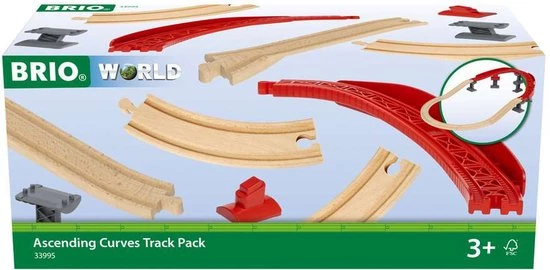 Til je BRIO World treinsets naar ongekende hoogtes met het 33995 Ascending Curves Track Pack. Deze kronkelige, omhoog- en omlaaggaande rails geven snelheid, hoogte en ook veel kleur aan je spoorweg. Gebruik deze treinset op zichzelf als een gesloten circuit, of bouw hem binnen een bestaande BRIO World omgeving voor extra hoogte, snelheid en… plezier.