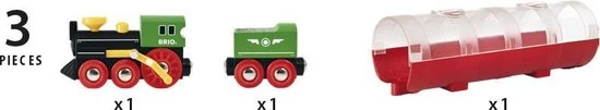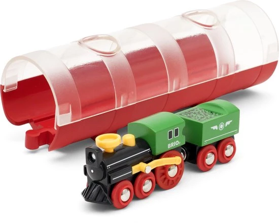 De Gouden eeuw van de treinen komt weer tot leven met deze klassieke stoomtrein.De slimme verpakking van de trein kan ook in een stijlvolle doorzichtige tunnel worden getransformeerd – zet deze op een BRIO World rails en daar ga je!