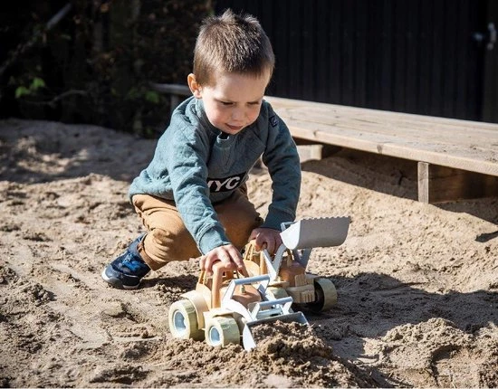 Sturdy, durable tractor in subdued, natural colours, with a perfect front loader for a sandbox. The toy stimulates a child?s hand?eye coordination when filling and emptying the scoop, for instance.