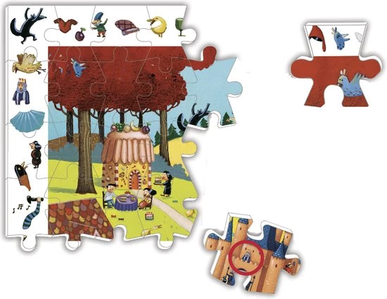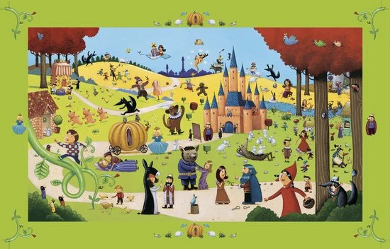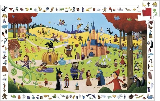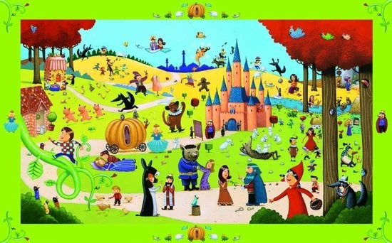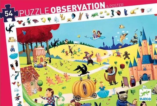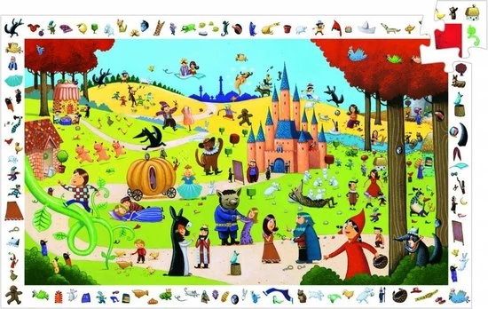 Een sprookjesachtige ontdekpuzzel van 54 stukjes met poster.Vind jij alle voorwerpen en figuren die op de rand staan afgebeeld?Afm. ca. 38×61 cm. 4-6 jr.