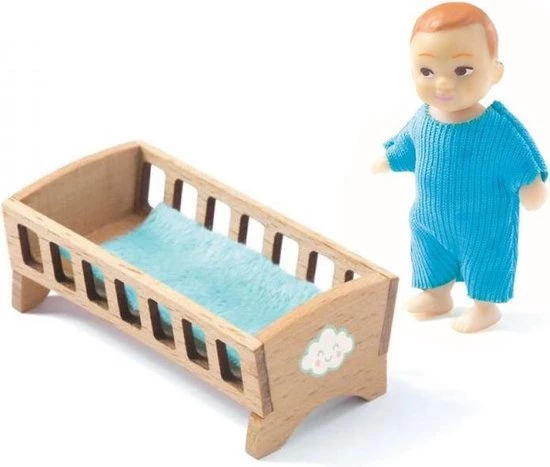 Dit poppenhuissetje bestaat uit Baby Sacha en een schattig houten bedje met matrasje. Je kunt de ledematen van baby Sweetie bewegen zodat je Sweetie in verschillende houdingen kunt neerzetten of laten zitten. Dit setje behoort tot de serie poppenhuizen en meubels van de ‘Mon Petit Home’ collectie van Djeco.
