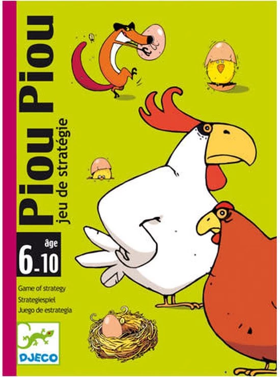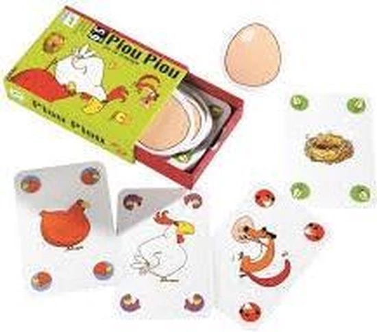 Paniek in het kippenhok! De vos sluipt naar binnen en de eieren zijn nog niet opengegaan… Een kaartspelletje van het Franse merk Djeco. De winnaar van het spel is de eerste die erin slaagt om 3 kuikens te bemachtigen.