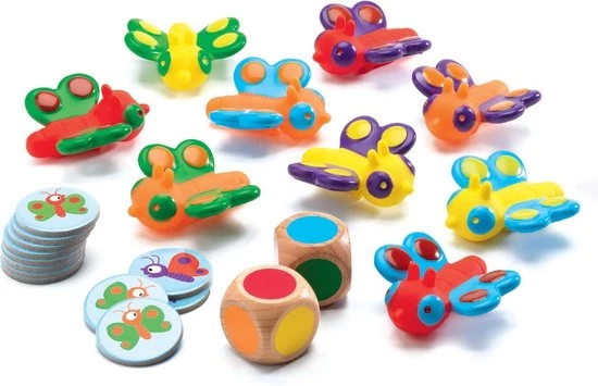 Kleine vlindertjes vliegen rond in de tuin. Wie vangt het snelst de vlinder die qua kleur overeenstemt met de kleur van de dobbelsteen? Ontdek dit leuke snelheids- en observatie spelletje Little Observation van Djeco!