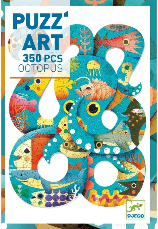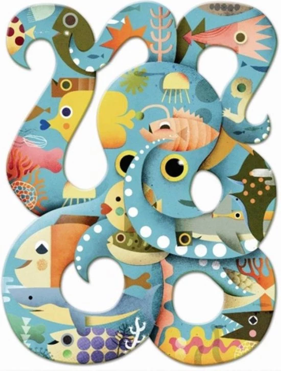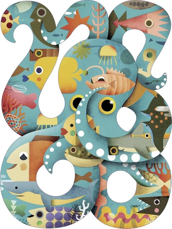 Deze puzzel Octopus uit de serie Puzz’Art van het Franse merk Djeco kronkelt als een inktvis, zonder hoeken en rechte randen. Dat geeft een andere dimensie aan het puzzelen. Binnen het silhouet van een octopus zijn er nog meer vissen in allerlei vormen en kleuren.