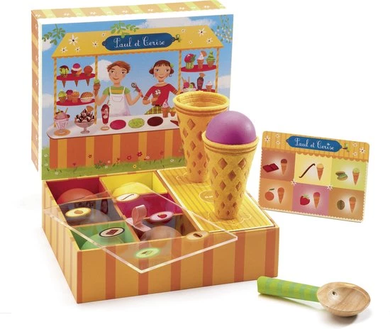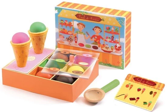 Met deze set van het Franse merk Djeco kan je ijsjeskraam spelen! De (houten) ijsjes zien er bijzonder smakelijk uit in deze levendige snoepkleurtjes! Schep het hoorntje vol zoals je zelf verkiest of volgens de bijgeleverde kaart.
