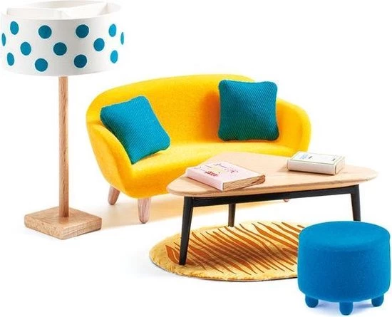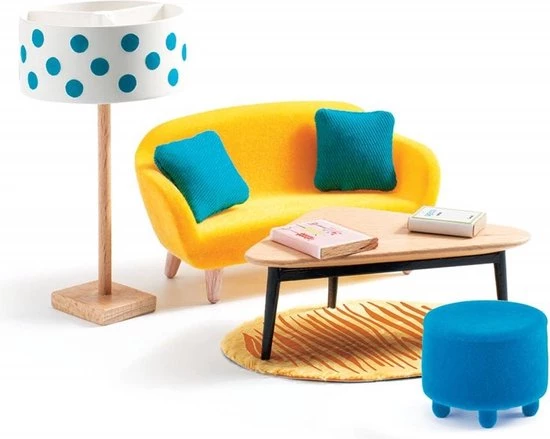 Leuke woonkamer set voor in het poppenhuis. De set bestaat uit een gele bank met 2 blauwe kussens, een staande lamp, een salontafel, een blauwe poef, een tapijt en 2 boeken. Deze woonkamer set behoort tot de serie poppenhuizen en meubels van de ‘Mon Petit Home’ collectie van Djeco.