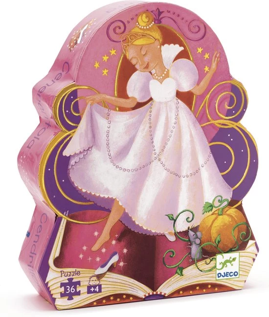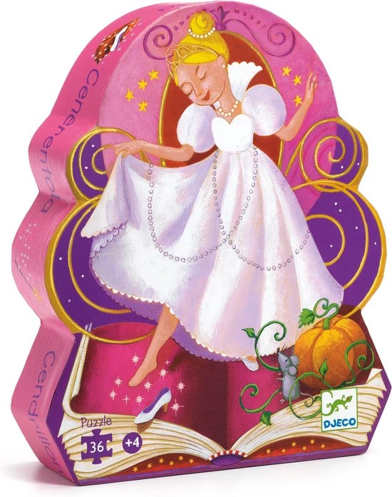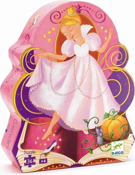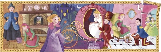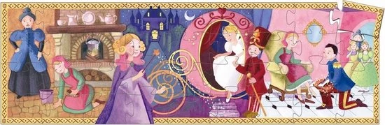 Een sprookjespuzzel van het Franse merk Djeco. Op de vrolijk gekleurde puzzel staat een afbeelding van het verhaal van assepoester.