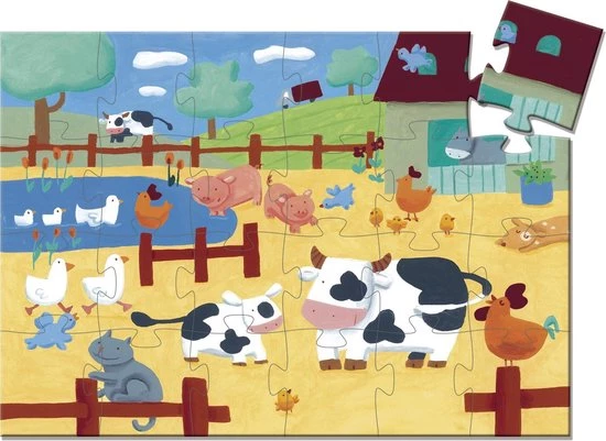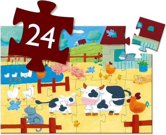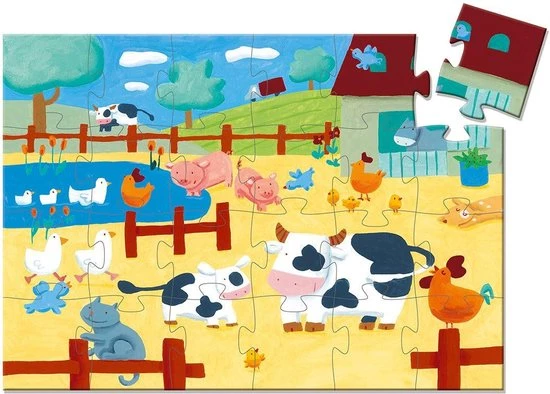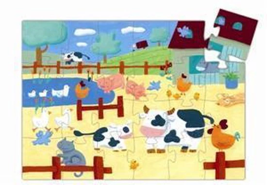 Een mooie legpuzzel van 24 stukjes van Djeco. De puzzelstukken hebben een grootte van 7 x 8 cm en zitten verpakt in een mooie doos. Op de afbeelding is een boerderij met allerlei dieren te zien. Als de puzzel af is, heeft hij een grootte van 42x 30 cm.