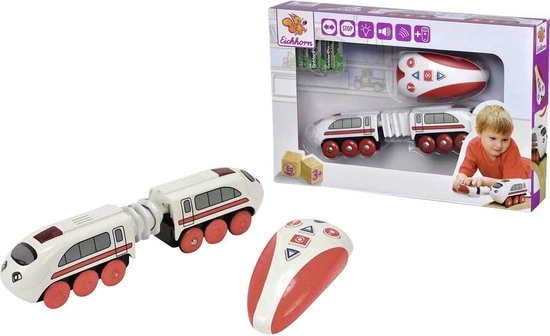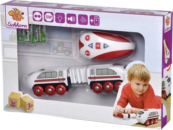 Dit batterij aangedreven Eichorn treinstel is 20.5 cm lang, en is te gebruikenop alle sporen van Eichorn. De trein heeft 5 functies : vooruit, achteruit, start, stop, licht en geluid. De bediening gebeurt via een infrarood afstandsbediening. Vanaf 3 jaar. 4 x1.5V AA batterijen inbegrepen.