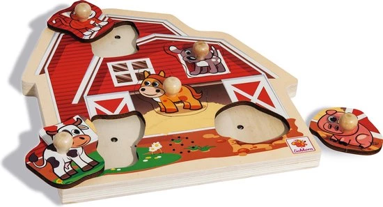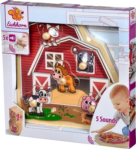 Eichhorn-puzzel met geluid: met de Eichhorn-geluidspuzzel ontdekken de kleintjes vijf dieren van de boerderij. Zorg dat de dierenmotieven juist zitten en er weerklinkt een verbaasde dierenstem. Alleen FSC? 100% hout uit duurzame bosbouw wordt gebruikt voor de productie van de Eichhorn geluidspuzzel. De 6-deligpuzzel is 25x25cm groot en geschikt voor kinderen vanaf twee jaar. Batterijen 2 x 1.5V-LR03 inbegrepen.