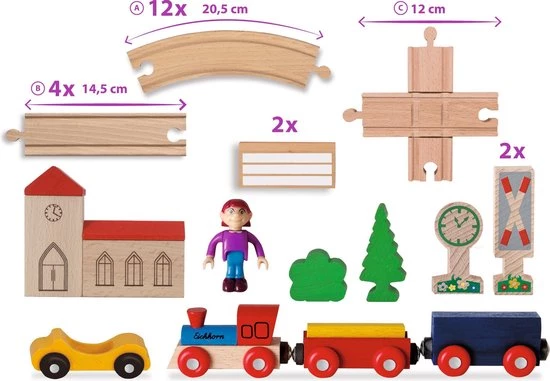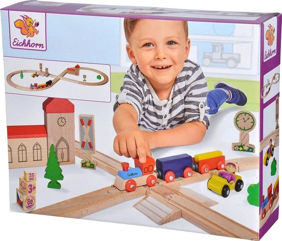 De houten spoorbaan van Eichhorn laat je vol plezier en fantasie een wereld nabouwen met huizen, bomen en een prachtige spoorbaan. Rijd met de trein over een traject van bijna drie meter lang: de 35-delige baanset is geschikt voor kinderen vanaf 3 jaar. Combineerbaar met alle andere treinsets van Eichhorn.