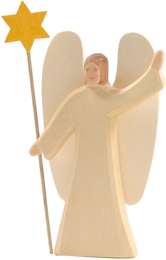 Zeer mooi uitgevoerde houten engel met ster. Om sfeervol uw seizoenstafel te decoreren. De staf met ster kunt u naar believen toevoegen of verwijderen.