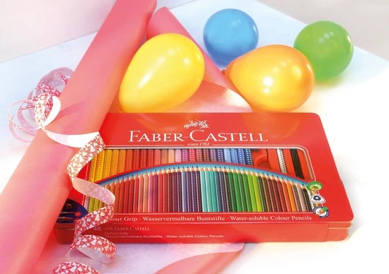 Kleurpotlood in ergonomische driehoekige vorm met gepatenteerde Soft-Grip-zone. Stift bevat zeer lichte pigmenten en is wateroplosbaar. Driehoekige vorm bevordert de drie punt grip. Geschikt voor rechts- of linkshandige kinderen. Breukvast vanwege speciale belijming. Met ruimte voor uw naam. Kan uit de meeste stoffen worden gewassen. Eenvoudig te slijpen met een kwaliteit slijper. Metalen etui met zichtvenster a 48 stuks inclusief penseel, puntenslijper en Grip 2001 HB potlood.