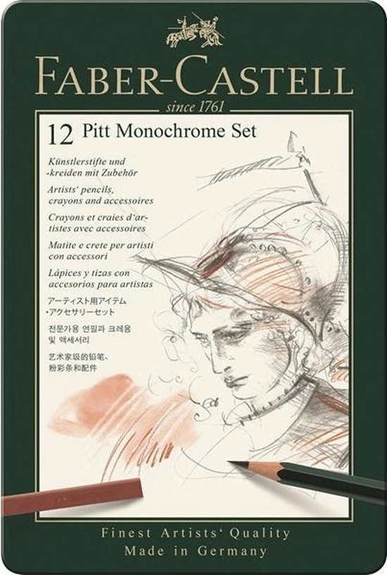 Monochrome set Faber-Castell Pitt. Geselecteerd assortiment bestaande uit houtskool, grafietpotloden, krijt, pastelpotloden en kneedgum. Inhoud: 12-delig. Bliketui.