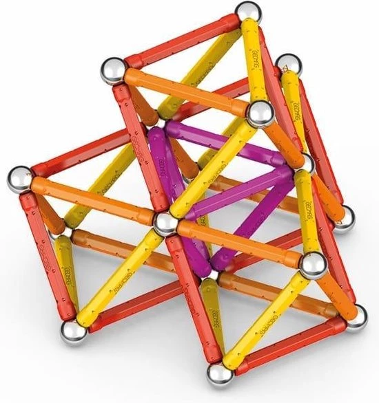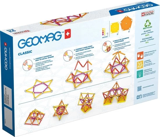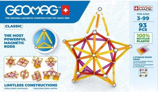 Geomag is een ingenieus maar eenvoudig constructiesysteem met magnetische staven, stalen bollen en magnetische bouwstenen waarmee je oneindig veel figuren en driedimensionale constructies maakt.Door de krachtige magneten, unieke klik, hoogwaardige materialen, sterkte constructie en geweldige kleuren wordt bouwen leuk en gemakkelijk, dit is 100% Geomag!Het geweldige speelgoed stimuleert het ruimtelijke inzicht, het ontwikkelt de bouwknobbel en zet aan tot creativiteit en logisch denken, zelfs voor de jongste kinderen vanaf 1 jaar.Indien kinderen jong beginnen, dan zijn ze later echte professionals en in staat de moeilijkste bouwwerken in elkaar te zetten.Wacht niet langer en laat je kinderen de oneindige mogelijkheden ontdekken van Geomag.Het klassieke magnetische constructiesysteem van Geomag voldoet aan de hoogste normen van ecologische duurzaamheid.Alle onderdelen zijn gemaakt van 100% gerecycled plastic.Door de krachtige magneten, unieke klik, hoogwaardige materialen, sterkte constructie en geweldige kleuren wordt bouwen leuk en gemakkelijk, dit is 100% Geomag!Nog een geweldige innovatie: de nieuwe opbergdoos in zakformaat voor staven en bollen is praktisch, duurzaam en natuurlijk gemaakt van 100% gerecycled plastic. Ook bevatten de kartonnen dozen een hoog percentage gerecyclede materialen.Inhoud:44 Staven44 Bollen2 Vierkante panelen3 Vijfhoekige panelen