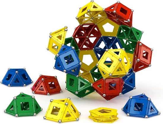 Deze set bevat magnetische staven, stalen bollen, plastic panelen en activiteitenkaarten/boekje.