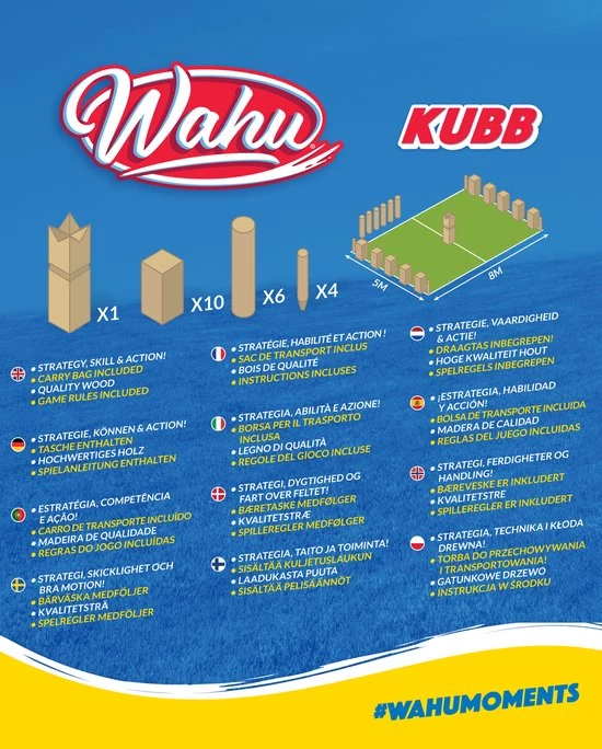 Kubb is het gezelschapsspel voor jong en oud! Kubb is ideaal om te spelen in de tuin, het park of op het strand. Ga achter de lijn staan en gooi de houten torens om. Het spel kan gespeeld worden met twee of meerdere personen. Gooi alle torens van je tegenstander om en win!