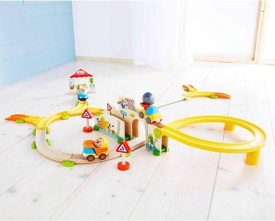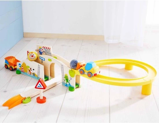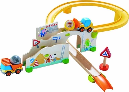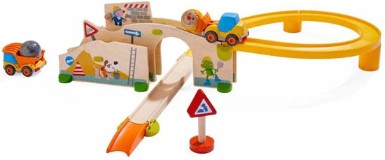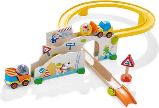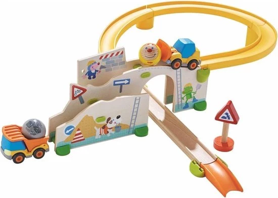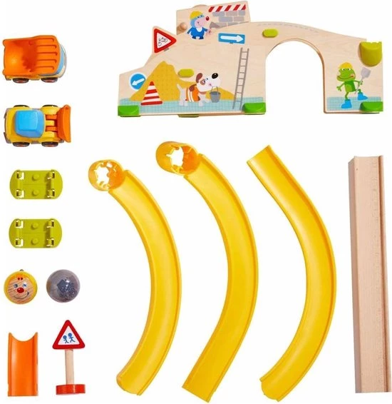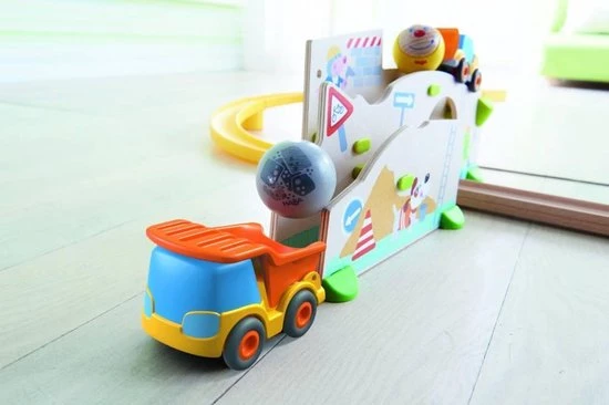 Super plezierige actie effecten beleef je met deze knikkerbaan van het Duitse merk Haba! Je kan de knikker naar de vrachtwagen duwen met de graafmachine en hem dan naar de werf transporteren.