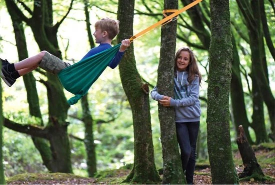 Ontspan wanneer je in de natuur bent met deze leuke draagbare schommelset! Eenmaal tussen twee sterke bomen geplaatst, is het een leuke schommel of een zitplaats voor kinderen. Gemaakt van gerecycled polyester van gemiddeld drie petflessen.