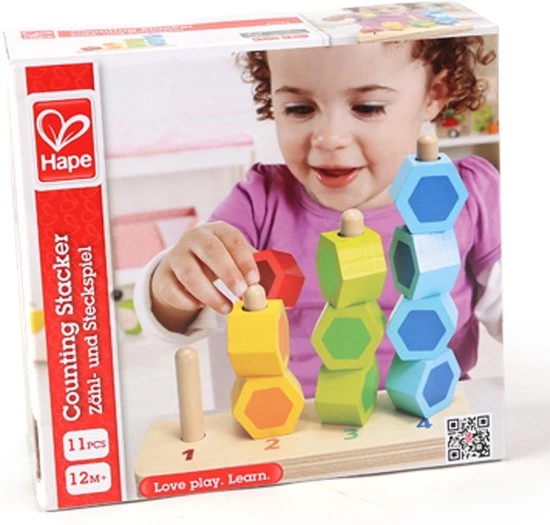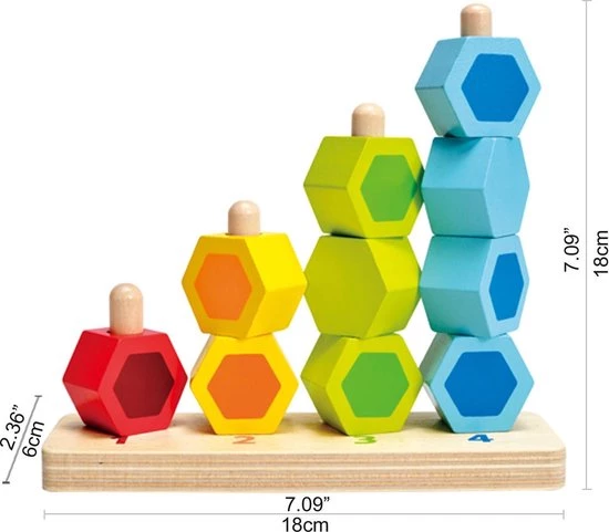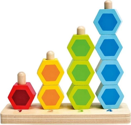 Dit stapelspel bestaat uit een houten blokje met vier stokjes in verschillende lengtes met ieder een eigen getal in een andere kleur. Herken jij de kleur van het puzzelblokjes bij het getal met dezelfde kleur, plaats het blokje dan op het juiste stokje. Zo leren kinderen spelenderwijs kleuren herkennen en tellen.