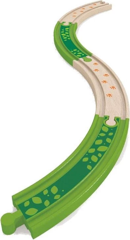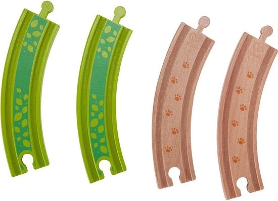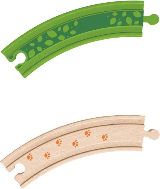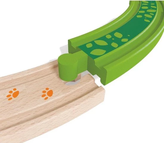 Je kunt je treinbaan probleemloos uitbreiden met deze Jungleset. Verbind de twee verschillende soorten spoorstukken en beeld je in dat je een cirkelvormige rit door het regenwoud maakt! Deze set bestaat uit twee groene spoorstukken met een junglemotief en twee spoorstukken van natuurlijk hout die samen een cirkelvormig treinspoor vormen. Verbind ze met elkaar of voeg de stukken aan je bestaande houten spoorweg van Hape toe voor variatie in je treinspoor.