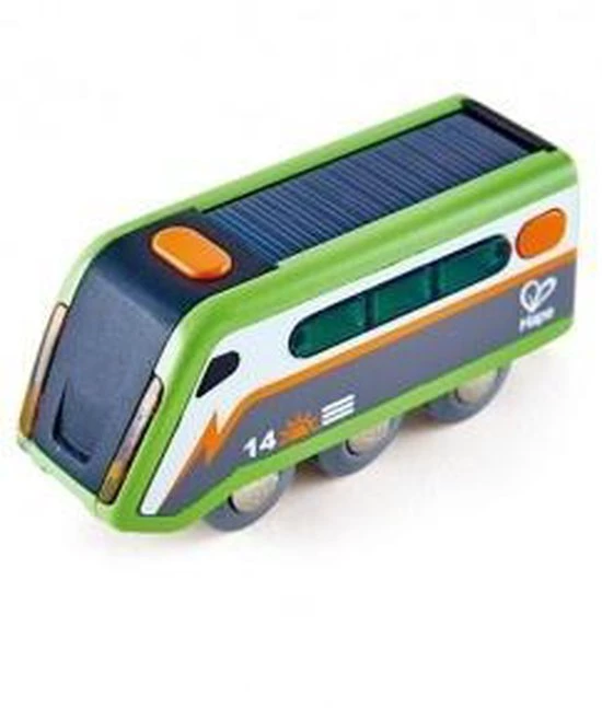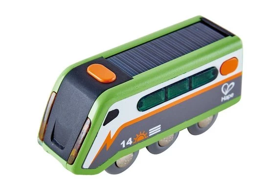 Iedereen aan boord! Deze slimme locomotief heeft een zonnepaneel dat genoeg elektriciteit opwekt om de eigen lichten te kunnen aansteken. Zo heb je geen batterijen meer nodig! Kijk naar die felle lichten wanneer je de trein over de sporen duwt. Zet de locomotief in de zon om de accu op te laden, de gekleurde ledlampjes laten zien hoe vol de accu nog is.