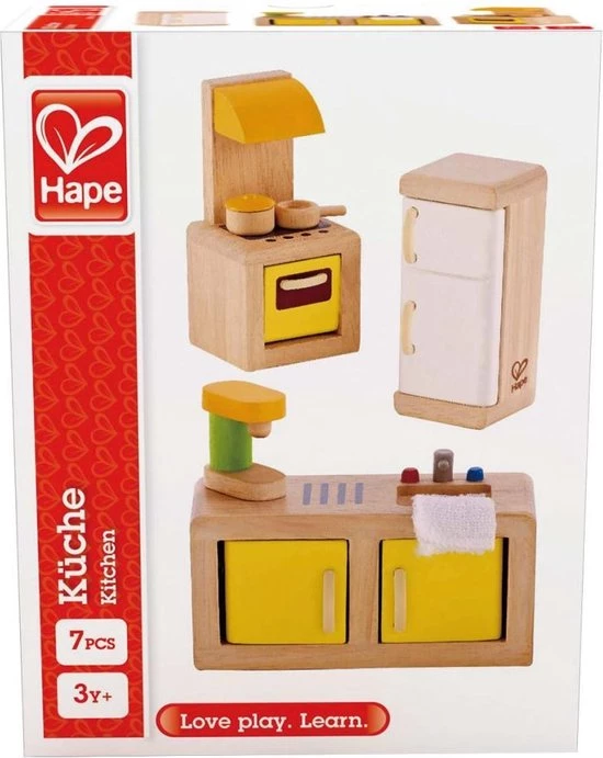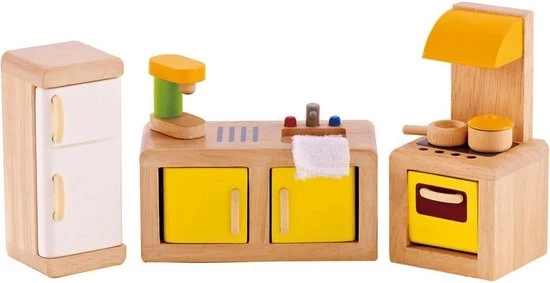 Deze complete keukenset is voorzien van een koelkast, gasfornuis, spoelbak, pot, pan, handdoek, en een koffiezetapparaat. Wie wil de kok zijn en gaat koken voor het gezin? De keuken is gemaakt van massief hout. Geschikt voor kinderen vanaf 3 jaar.