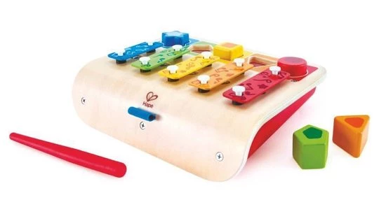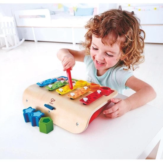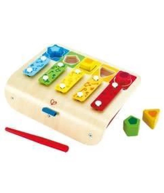 Deze multifunctionele xylofoon is niet alleen een xylofoon maar ook een puzzel! Druk op de blokken of sla op de kleurrijke stukken met de rode stok om een melodie te produceren. Gemaakt van hoogwaardig, stevig hout en metaal.
