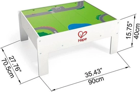 Kleur: wit en groen Materiaal: metaal en MDF Afmetingen: 90 x 70,5 x 40 cm (L x B x H) Eigenschappen: een gedeelte voor opbergen en een gedeelte voor spelen Het moedigt het fantasierijk spelen en creativiteit aan bij kleintjes Volledig passend met populaire treinproducten en -systemen Niet giftige coatings en kinderveilige materialen Rail-accessoires niet inbegrepen WAARSCHUWING: Niet geschikt voor kinderen jonger dan 36 maanden.