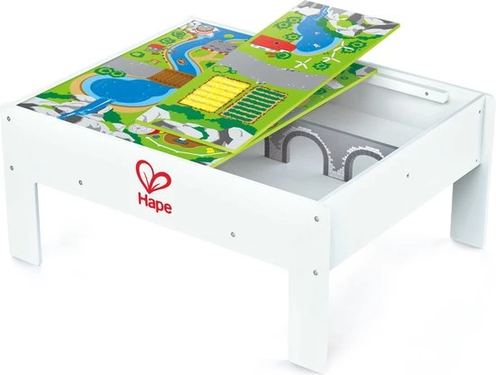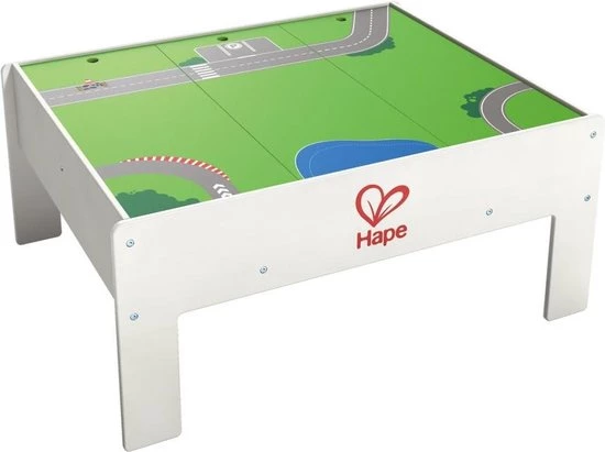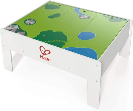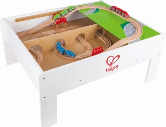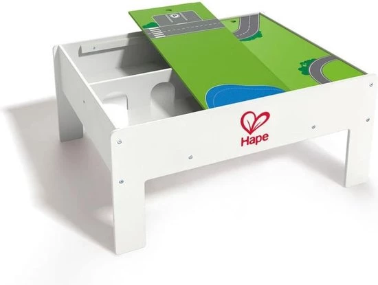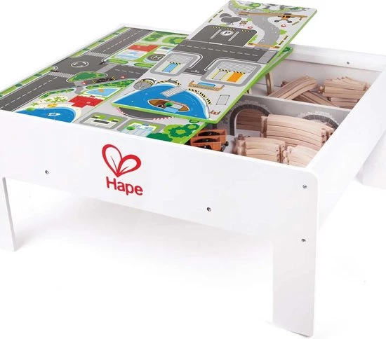 Deze Hape omkeerbare treinopbergtafel is kenmerkend door de twee kanten – een jungle en een stad thema voor nog meer speelplezier. Deze multifunctionele tafel is perfect voor het opbergen van treintjes wanneer ze niet in gebruik zijn, of om een geweldig parkour aan te leggen wanneer het tijd is om te gaan treinen! Hij helpt om de verbeeldingskracht en fantasie van kinderen te stimuleren. De unieke verhogingsmogelijkheid en een handige drievoudige structuur verschaffen gemak voor jouw persoonlijke favoriete opstelling. Het vlakke oppervlak is perfect, niet alleen voor treintjes, maar ook als knutseltafel of algemene speeltafel. De duurzame kindveilige verflaag en de stevige houtconstructie maakt dit een stuk speelgoed waar je kind nog jaren plezier mee zal hebben. Dit model is geschikt voor kinderen van 3 jaar en ouder. Rail accessoires zijn niet bij de levering inbegrepen.