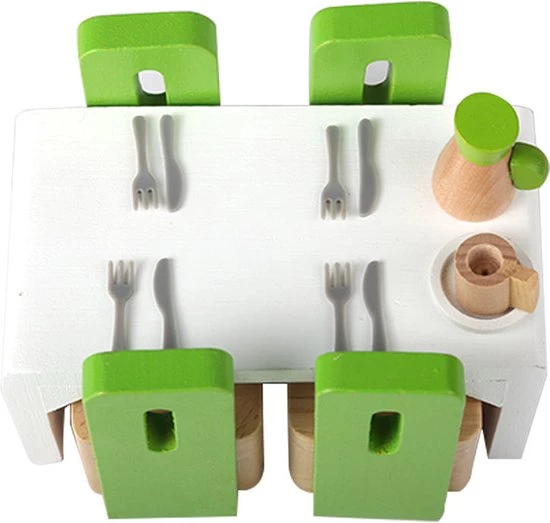 Dek de tafel en roep de familie want het is etenstijd! Deze set bestaat uit een tafel, 4 stoelen, 4 borden, 4 messen en vorken, 4 bekers, een waterkan en een een kast.