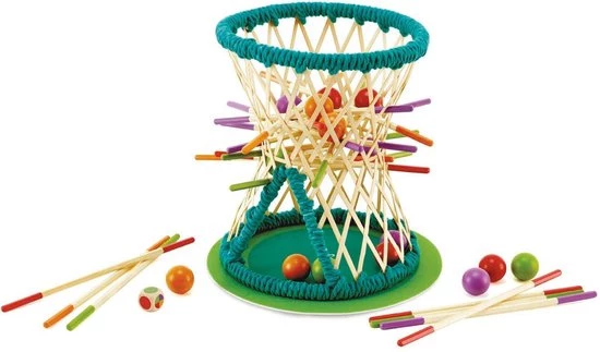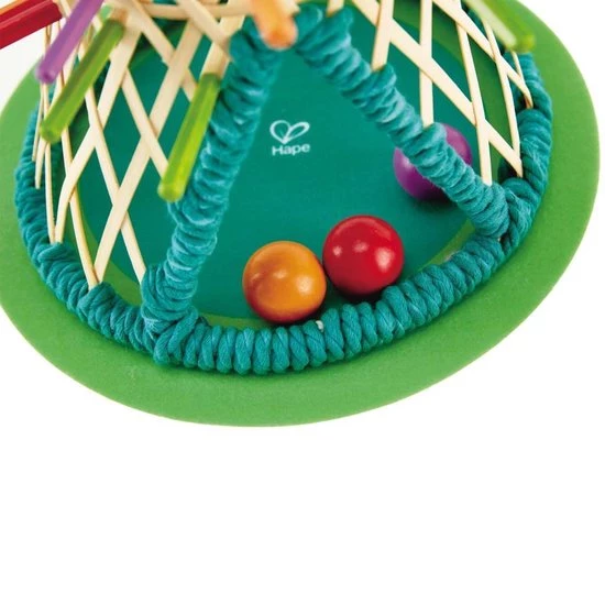 Het spel Pallina bestaat uit een grote houten korf van 24 x 24 x 32 cm, 20 bamboe staafjes en 16 houten balletjes in 4 verschillende kleuren, een basis en een handleiding.