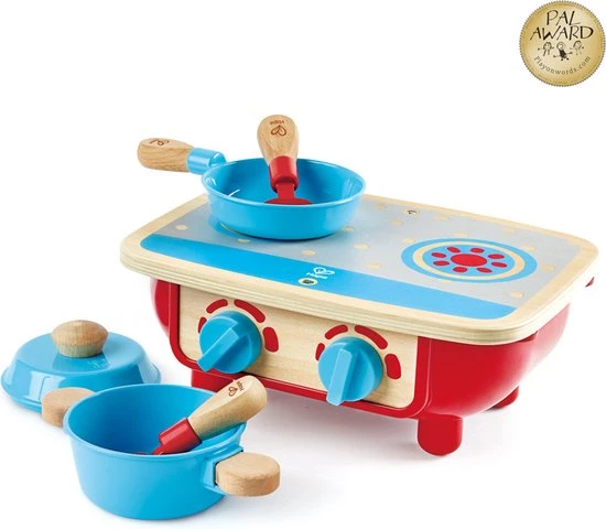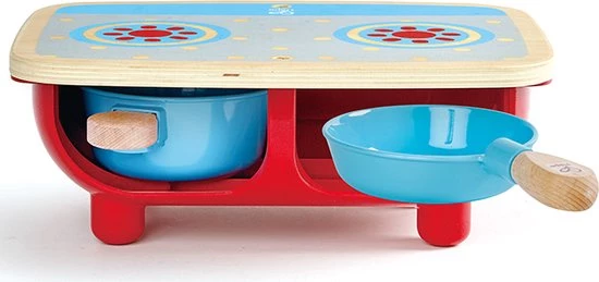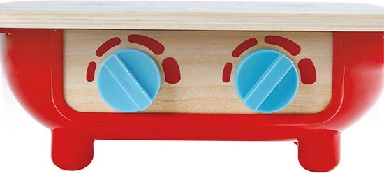 Maak heerlijk eten klaar voor je familie en vrienden! Dit leuke houten fornuis wordt geleverd met een pan met deksel, een koekenpan, een lepel en een spatel om mee te koken. Er zitten knoppen op die schattig klikken als je eraan draait. Berg je pan en koekenpan op in de ruimtes achter het fornuis wanneer je klaar bent.