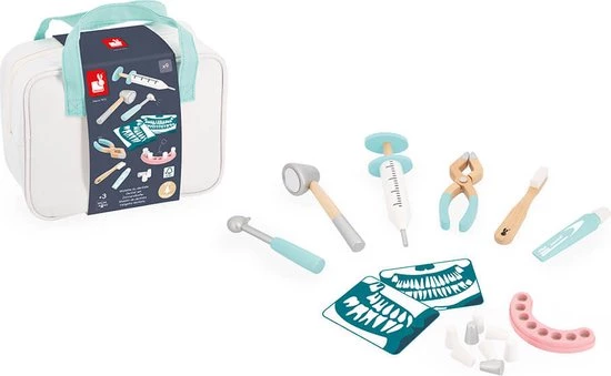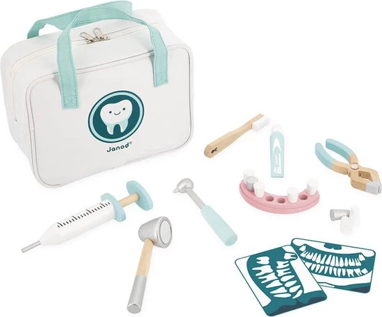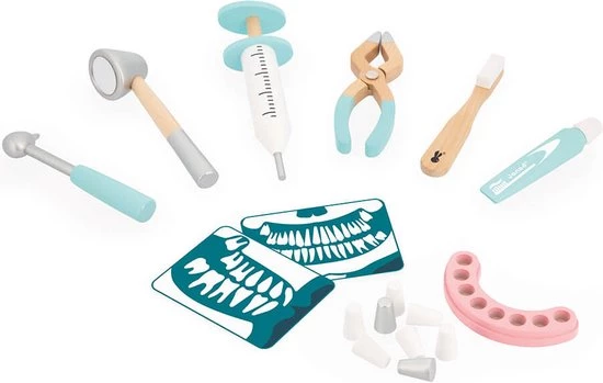 Wie gaat er een bezoekje brengen aan de tandarts? Met deze geweldige kit van de perfecte tandarts nodigt de hele tandartspraktijk zichzelf uit in huis voor momenten van spelen en lachen met familie of vrienden! Kinderen vanaf 3 jaar zullen graag de plaats van de specialist innemen en oefenen met de vele houten accessoires in dit geval: tang, een injectiespuit voor anesthesie, kunstgebit met 8 verwijderbare tanden, een tandspiegel om de kleinste gaatjes op te graven, een aardbei , een tube tandpasta en een tandenborstel, zodat de pati?nt met zijn kleine monsters kan vertrekken! Met 2 kaarten met r?ntgenfoto’s van de tanden kunnen kinderen hun diagnose stellen. Alle elementen in zeer zachte kleuren (aquarel water) kan worden opgeborgen in de draagbare kit met een vriendelijke lachtand, genoeg om afspraken met de tandarts te bagatelliseren! De accessoires van dit mooie imitatiespel zijn gemaakt van FSC?-hout (hout uit duurzaam beheerde bossen).