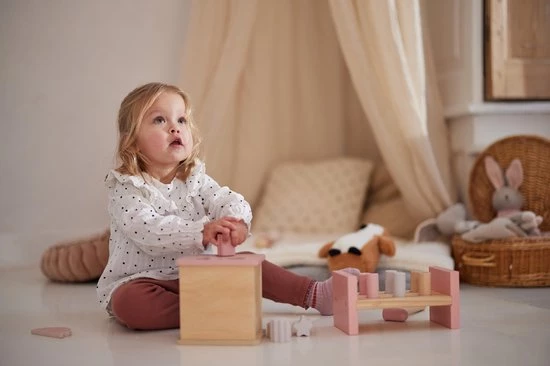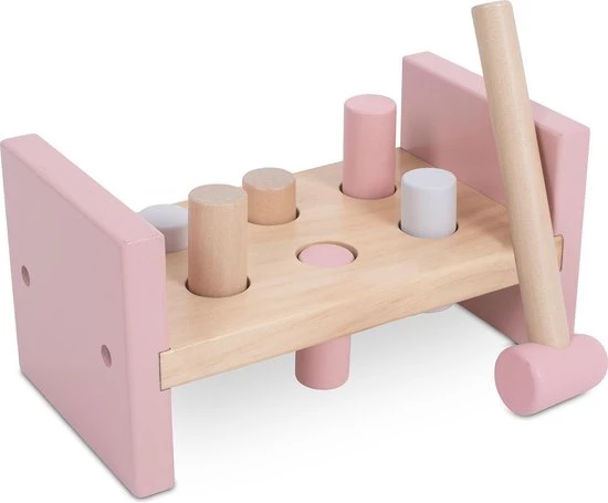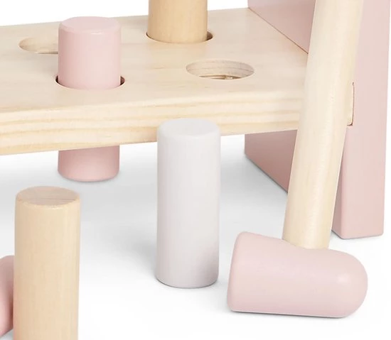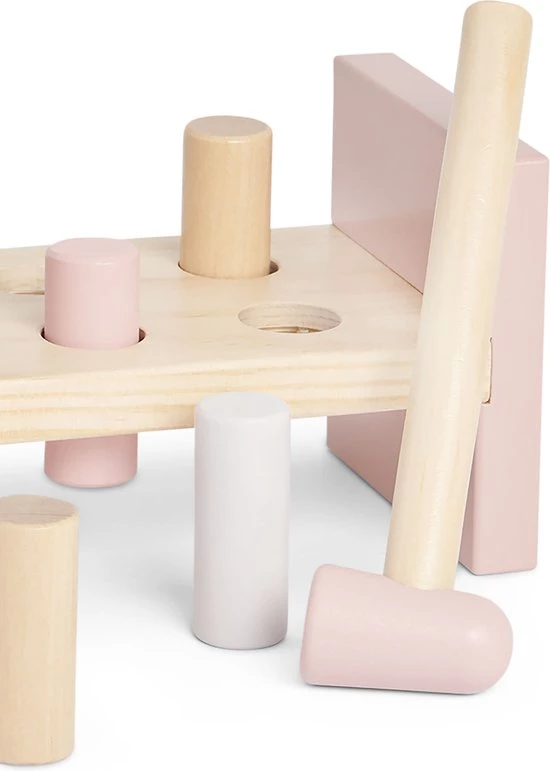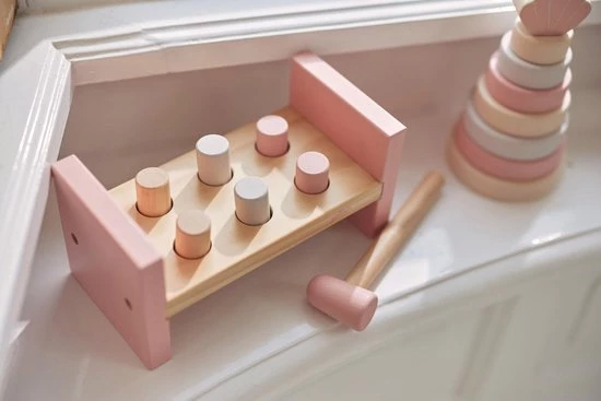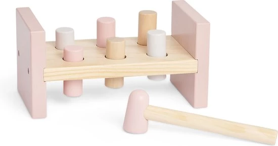 Geef je kind een houten hamer en zes kindveilige spijkers in een hamerbank. En jouw dreumes of peuter gaat los! Want niets is leuker om lekker te slaan met een hamertje. Lukt het jouw kind om de zes staafjes naar beneden te timmeren? Mooie uitdaging!