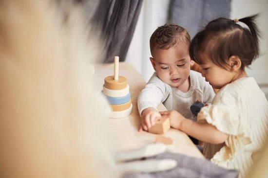 En als het gelukt is kun je gewoon nog een keer. Want je kiepert de toren om en begint weer opnieuw. Het valt nog niet mee om de ringen om het stokje te rijgen. Lukt het jouw dreumes of peuter wel?