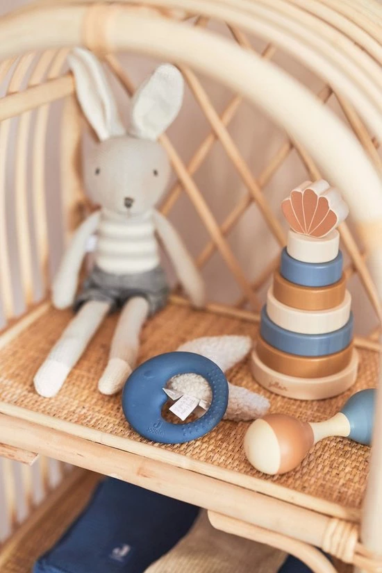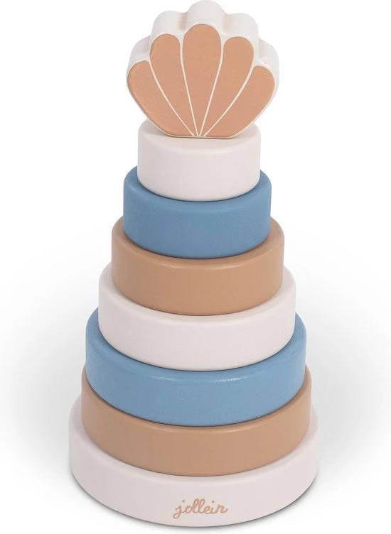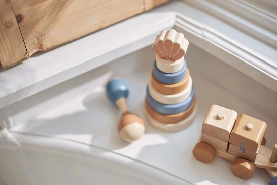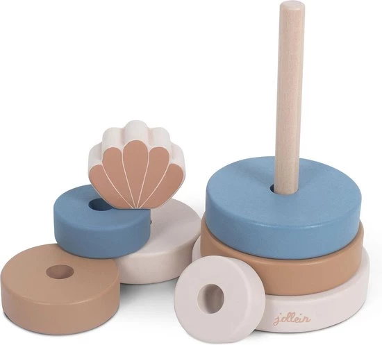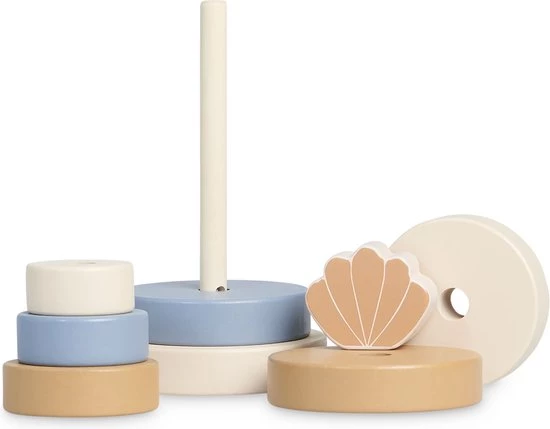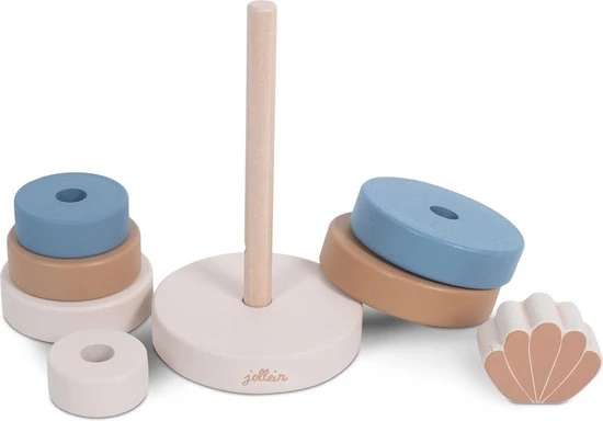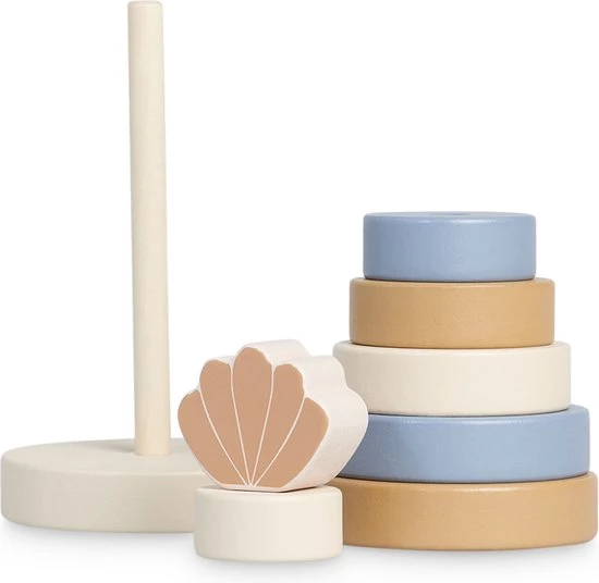 Stapelen van zes ringen kan op meerdere manieren. Het kan van groot naar klein of juist van klein naar groot? Of door elkaar? Laat je kindje het ontdekken en er mee spelen. Na de zes ringen kan er nog een schelpje bovenop de houten stapel.