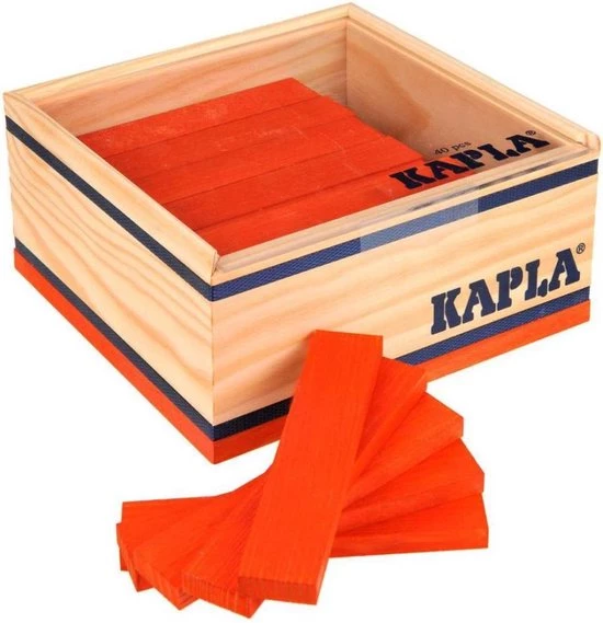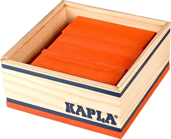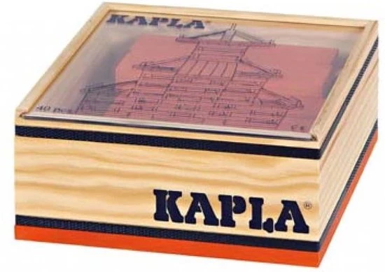 KAPLA Kleur doos met 40 grenenhouten plankjes van exact dezelfde ideale maatverhoudingen. De stevige doos is gemaakt van mooi afgewerkt hout met een deksel van doorzichtig plastic glas, waardoor je kunt zien welke kleur erin zit.