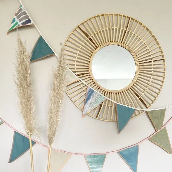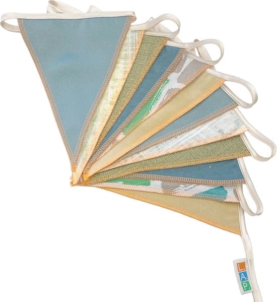 Waan je met deze mooie blauw, groen en naturel vlaggenlijn heel eventjes op het prachtige natuurgebied de Wadden. De kleuren zijn geinspireerd op het strand, de zee, de rietpluimen, het helmgras. Deze stijlvolle en kleurrijke vlaggenlijn is gemaakt van kwalitatieve reststoffen die overblijven bij de gordijnproductie. Onze prachtige slingers van restmaterialen zijn uniek en gaan jaren mee. Door de mooie materialen is de vlaggenlijn niet alleen leuk voor een feestje maar ook als sfeervol woonaccessoire, bijvoorbeeld voor de kinderkamer. De vlaggenlijn bestaat uit 24 vlaggetjes, heeft een afmeting van 7,5 meter en zit in een mooi opbergzakje. De verpakking is ook gemaakt van reststoffen.