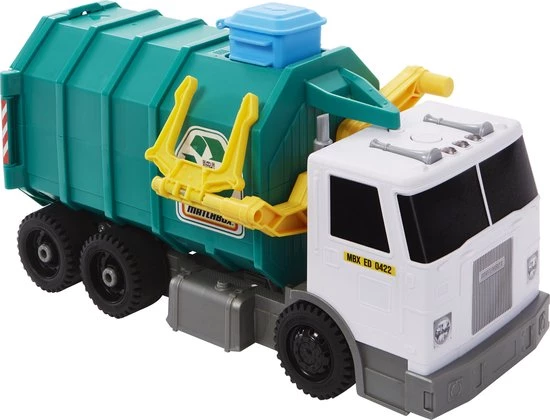 Matchboxâ„¢ promoot met trots milieubewustzijn door meer dan 80% ISCC-gecertificeerde plastic materialen* te gebruiken in de creatie van dit speelgoed en herinnert kinderen aan het belang van recycling. * Massabalansbenadering. ?Kinderen zullen deze truck meteen herkennen als degene die ze hun wekelijkse recyclebare spullen zien wegslepen. Druk op de knoppen bovenop de cabine om geluiden te activeren voor extra realisme.