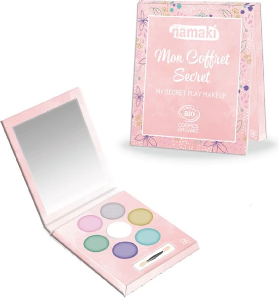 In de doos zitten zes kleuren make-up met? parelmoerachtige touch:? roze, groen, paars, blauw, goud en zilver.