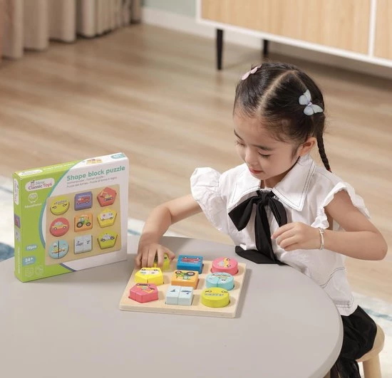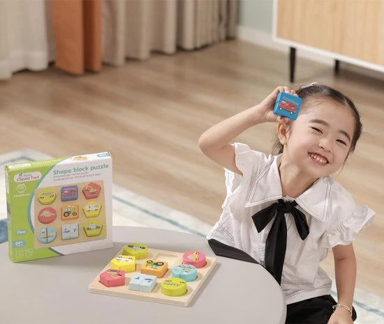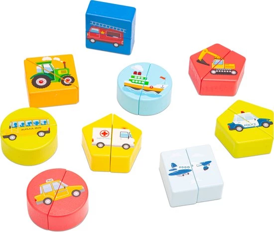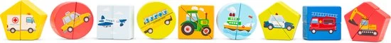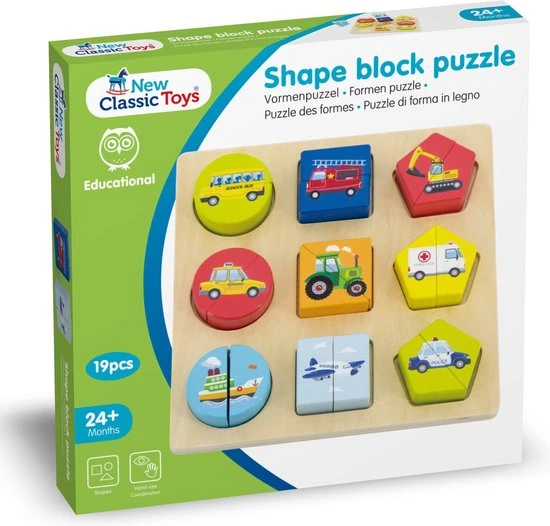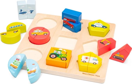 Ontdek de wereld van transport en voertuigen met deze houten blokpuzzel van New Classic Toys. Deze puzzel wordt geleverd met 9 voertuigen in verschillende kleuren en geometrische vormen. Met extra dikke puzzelstukjes, makkelijk vast te pakken voor kinderen. Met een boot, een vliegtuig, een ambulance, een schoolbus, een brandweerwagen, een graafmachine, een taxi, een tractor en een politieauto. Puzzels helpen kinderen waardevolle vaardigheden te ontwikkelen door middel van een activiteit die ze leuk vinden, zoals het ontwikkelen van hun fijne motoriek en het verbeteren van hun hand-oogcoördinatie. Het laat de kleintjes ook kennis maken met vormen, kleuren, boerderijdieren en tellen. Bij deze puzzel hoort een puzzelbord met achttien puzzelstukjes.