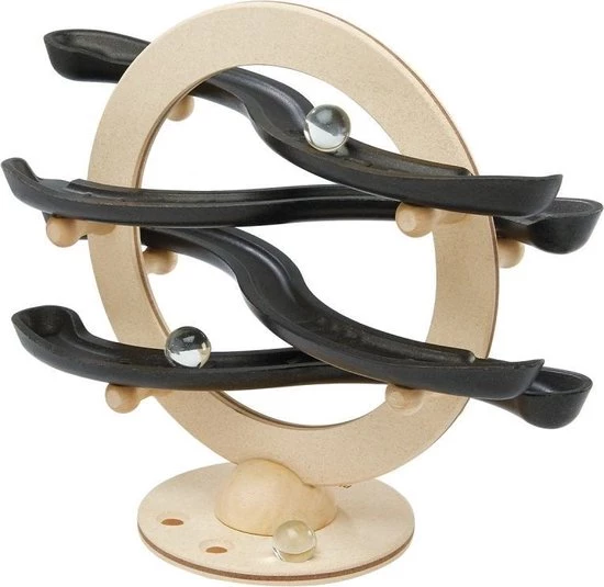 Een knikkerbaan met een prachtig design, echt een plaatje! De ronde basis van de knikkerbaan staat op een voet met ruimte om de knikkers te bewaren. Leg een knikker in de zwarte baan en hij rolt sierlijk naar beneden. Een leuk detail zijn de ribbels in de baan. Je hoort hierdoor de knikkers rollen.
