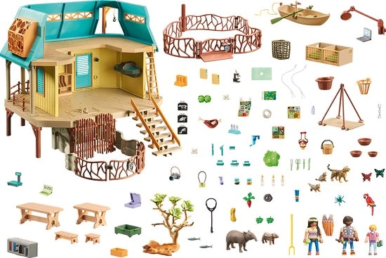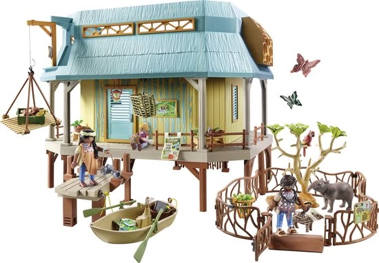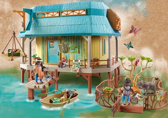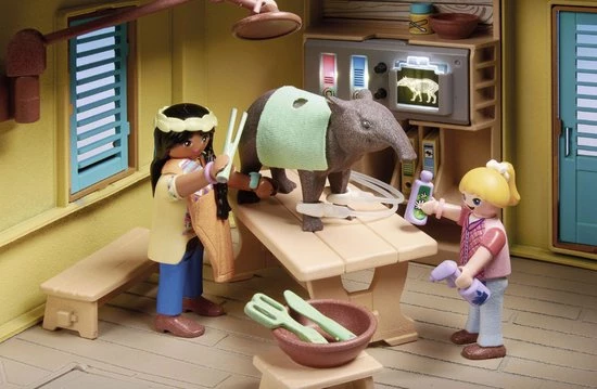 Het dierenverzorgingsstation met twee verdiepingen ligt langs de rivier. Hier worden de inheemse dieren verzorgd. Het station is te bereiken via trappen of aan de rivierzijde via een loopbrug. Het station is goed uitgerust voor de verzorging van de dieren en heeft een behandelkamer met een tafel, beweegbare chirurgische lamp, weegschaal, warmtelamp en verlichte monitor voor het bekijken van röntgenfoto’s. Een ladder leidt naar de zolder van het station. Daar wordt voedsel opgeslagen en apparatuur voor insectenonderzoek is beschikbaar. Na een succesvolle behandeling kunnen twee recreatie buitenverblijven door de dieren worden gebruikt. Momenteel wordt daar een familie tapirs en een ocelot gehuisvest. Zodra de dieren weer gezond zijn, worden ze vrijgelaten in de natuur. Deze gedetailleerde speelset neemt kinderen mee naar de fascinerende wereld van de Amazone.