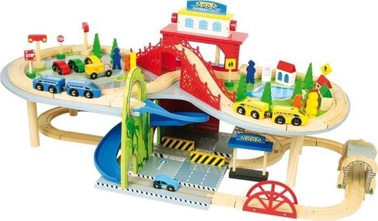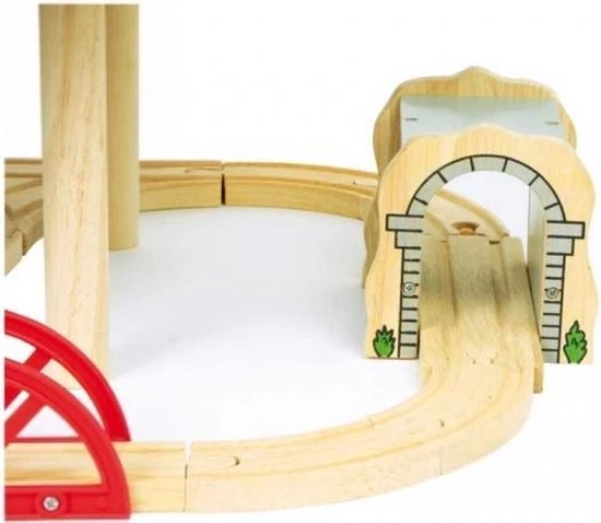 Deze Houten spoorbaan met zijn 34 rails, 2 bruggen, 1 tunnel en een berg om naar beneden te gaan en een avontuur op 2 niveau’s!