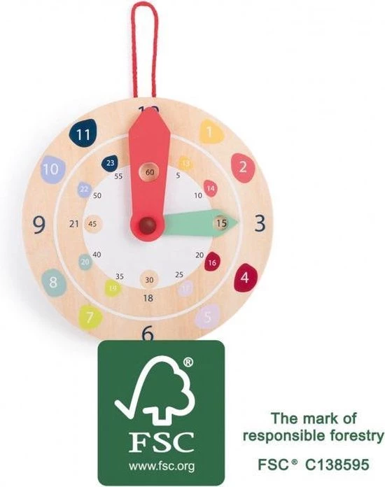 - Deze wandklok gemaakt van FSC? 100% -gecertificeerd hout is leuk om op een speelse wijze te leren klokkijken, met uren, minuten en secondes.